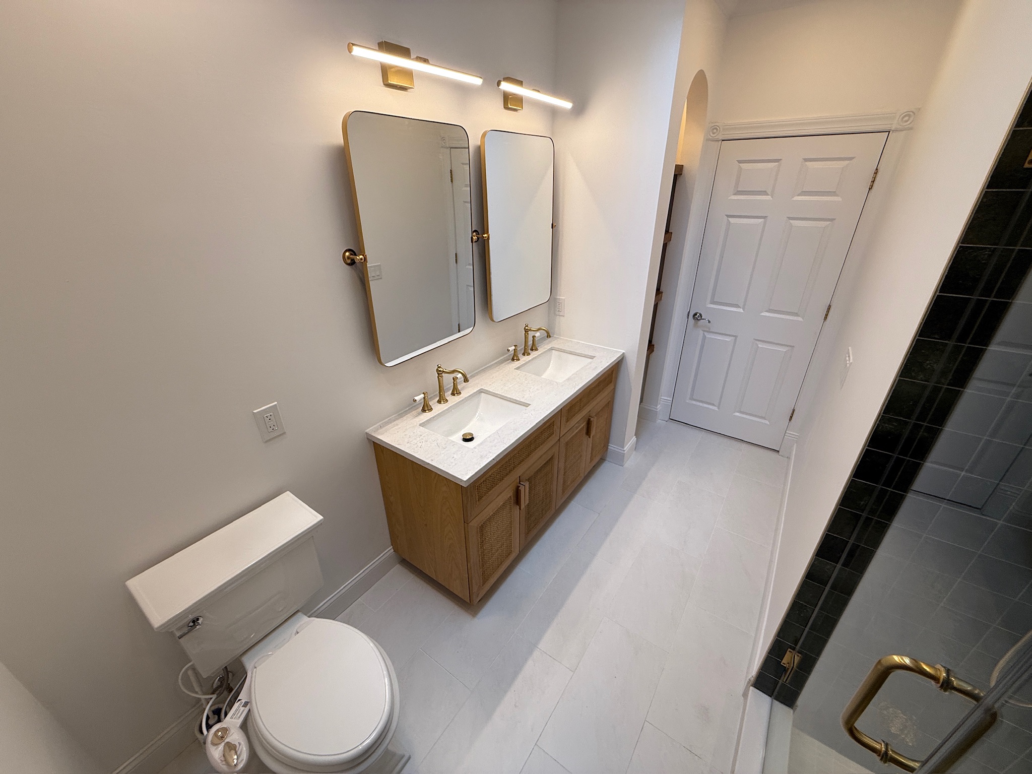 MHG Contracting completed this bathroom renovation project in Hamilton, NJ in 2024. A luxurious master bathroom renovation featuring a freestanding soaking tub, frameless glass walk-in shower with custom tile work, heated floors, and a double vanity with undermount sinks. Every detail was chosen to create a serene, spa-like retreat. This project demonstrates our commitment to quality craftsmanship and attention to detail in every bathroom renovation we undertake.